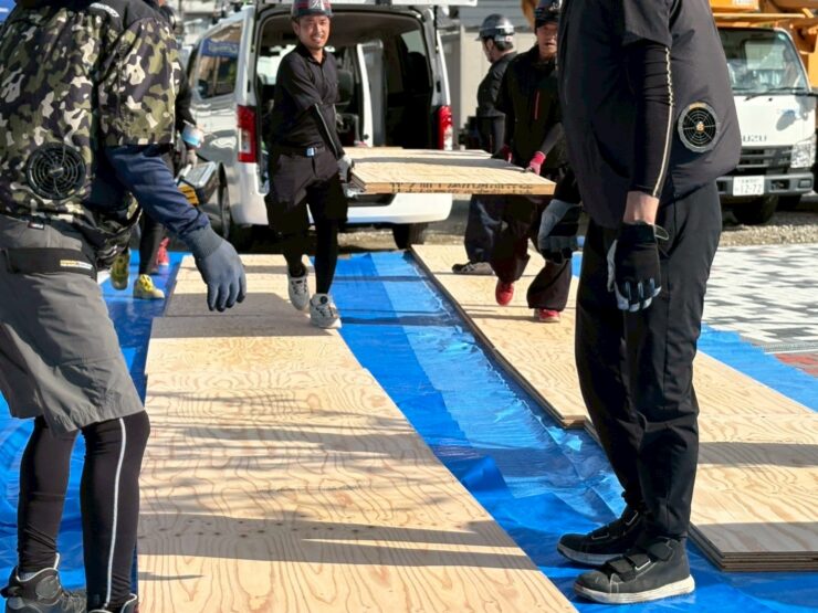 新しく敷き詰めたインターロッキングの上での施工となりましたので、厚み24mmのコンパネを2枚重ねて養生いたしました。