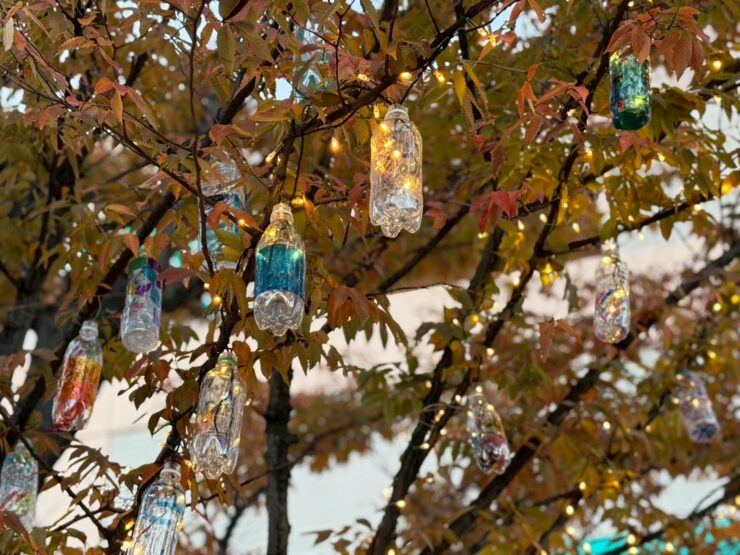 地元の小学校の子どもたちがペイントしたペットボトルを支給していただき、ランタンになるようにイルミネーションを仕込み、取り付けいたしました。