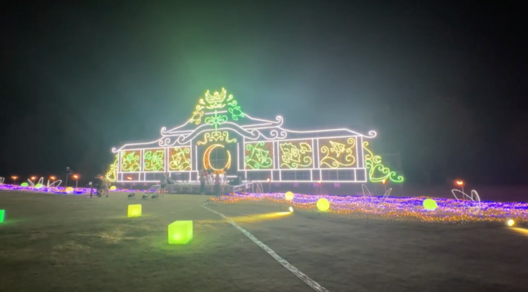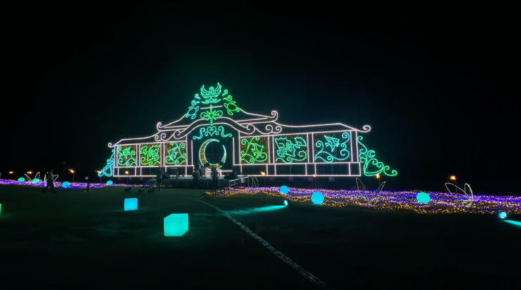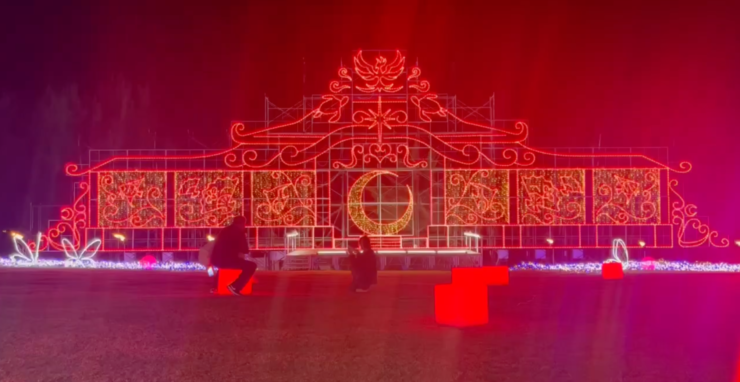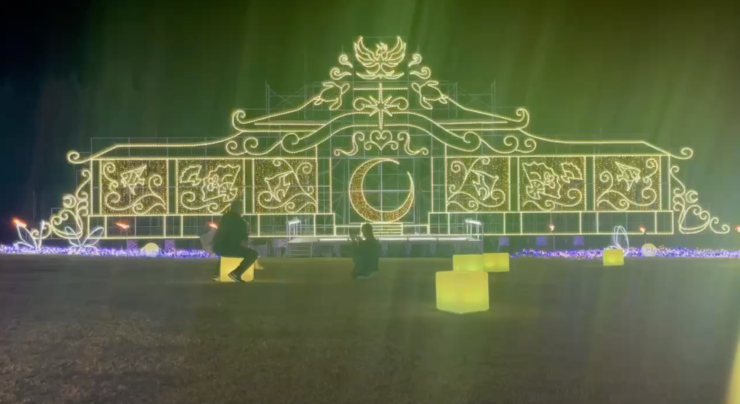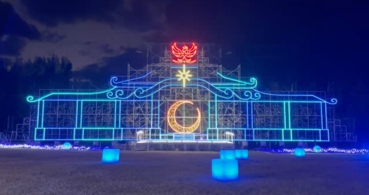 琉球ホテル名城ビーチ様2025-2026年 【月夜のワンダーイルミネーション】 今回は琉球城にフェニックスが舞い降りて光輝きます。 長さ約33メートルの琉球城と、広場全体が、音楽に合わせて奏でる光の演出は感動ものです。